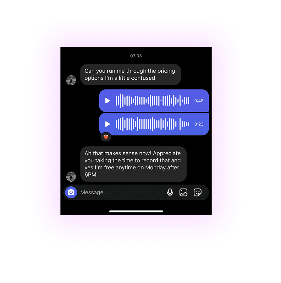 Audience AI learns everything about each potential customer—posts, highlights, even writing style—providing Nurture AI with a foundation to craft deeply engaging, personalized messages. With this insight, Nurture AI sends thousands of unique voice notes or video presentations daily, each tailored precisely to the recipient’s brand and interests
